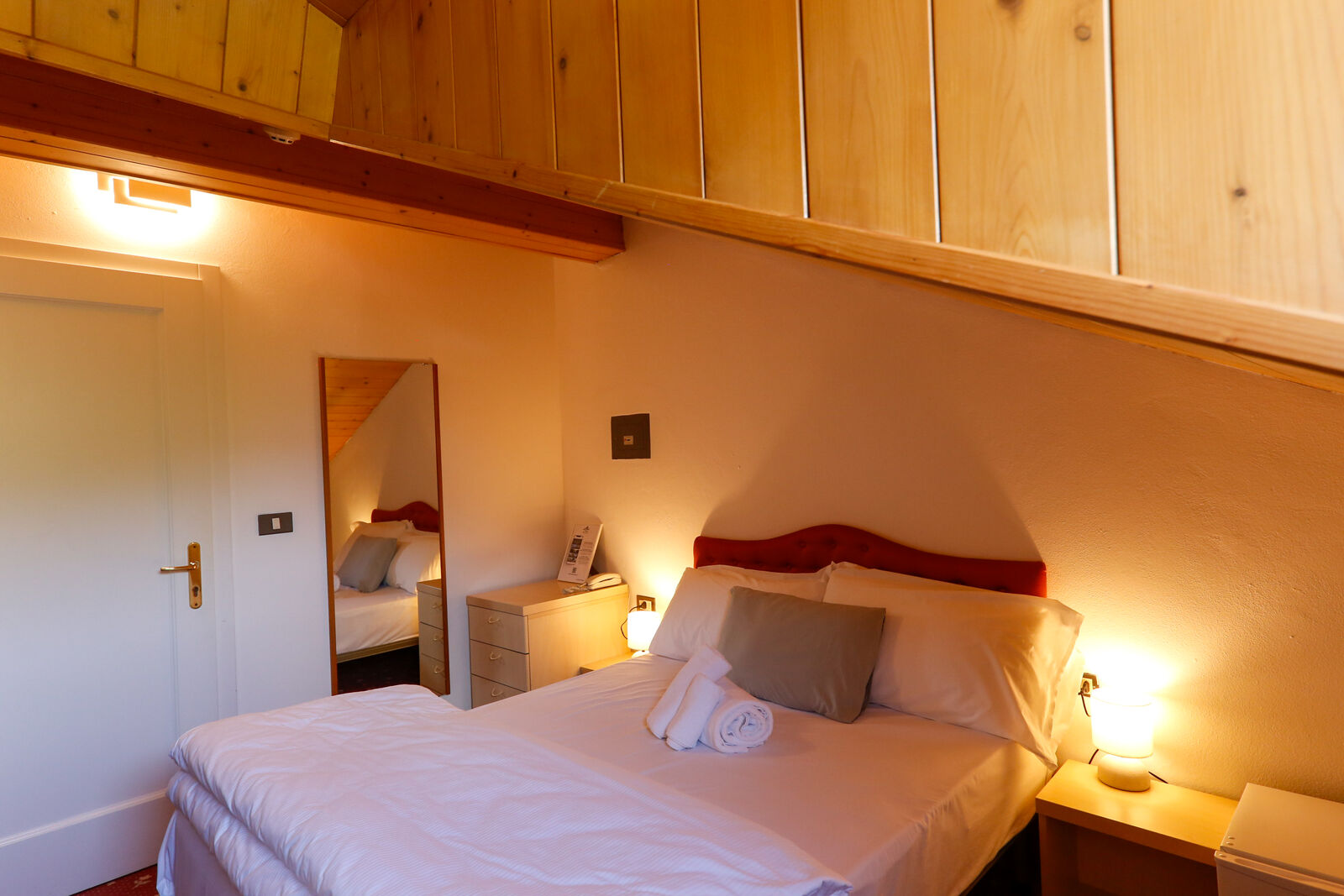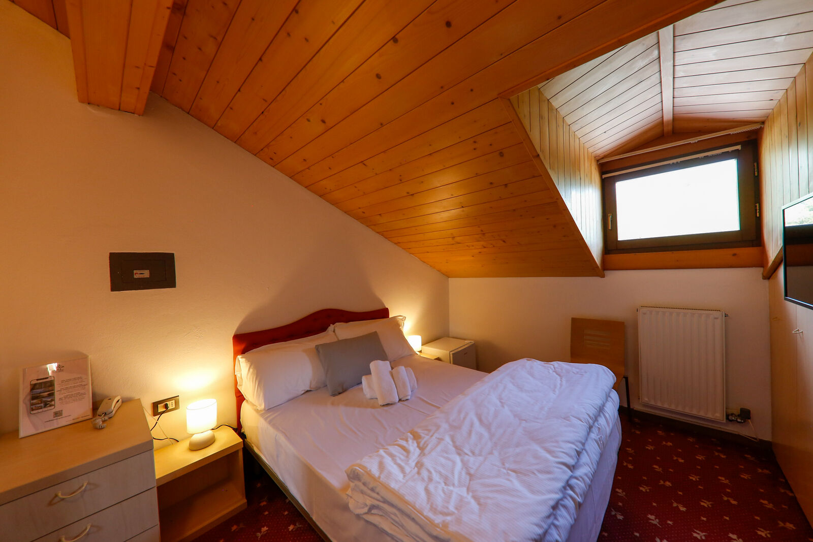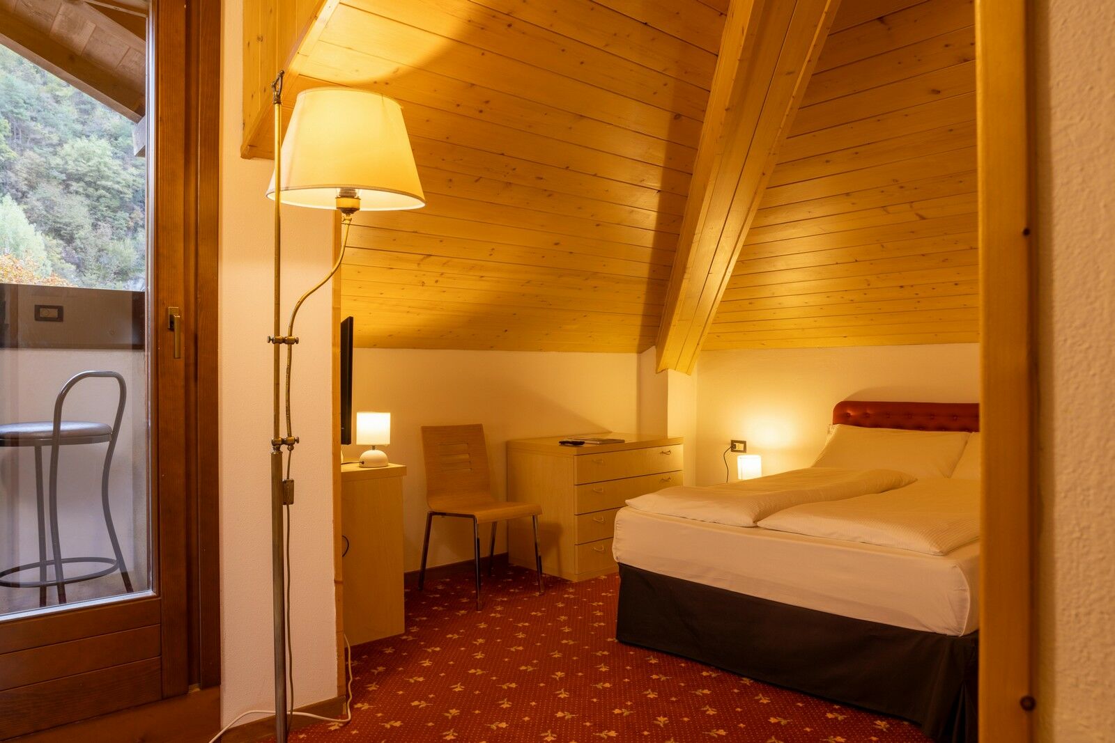 Una camera doppia all’ultimo piano del nostro hotel, con soffitto mansardato e spiovente, una morbida moquette, con vista sulle verdi montagne della Valle di Ledro. Silenziosa e con letto matrimoniale alla francese, è piccola ma accogliente: l’ideale per chi cerca un ottimo rapporto qualità-prezzo.