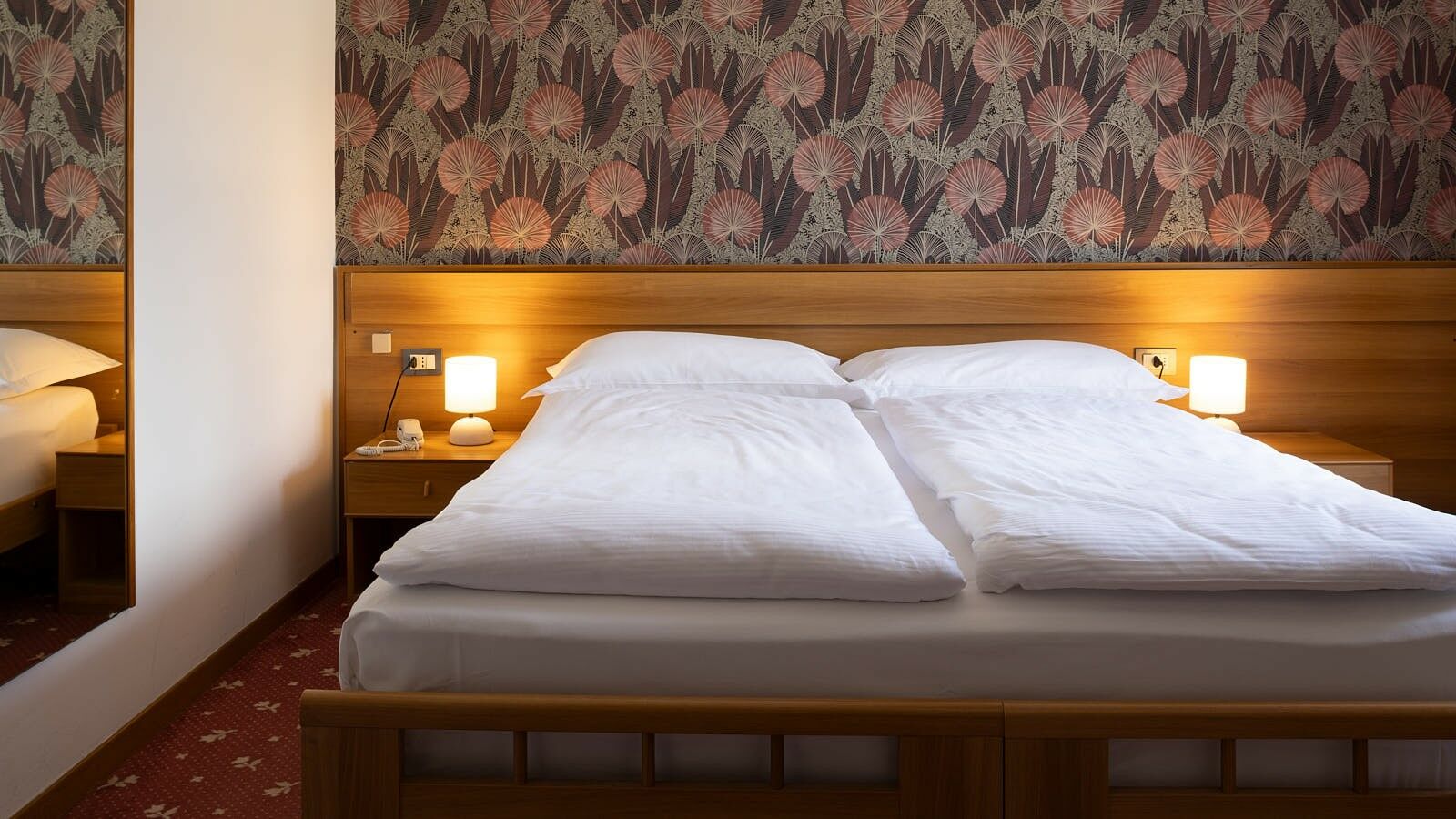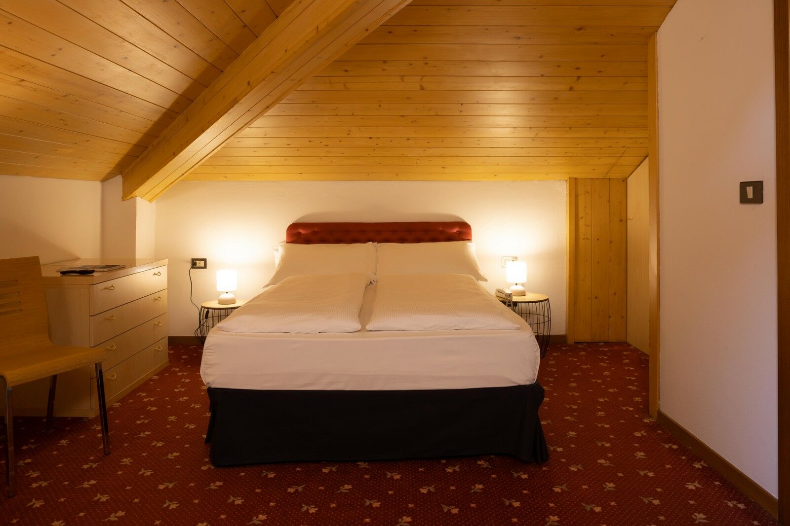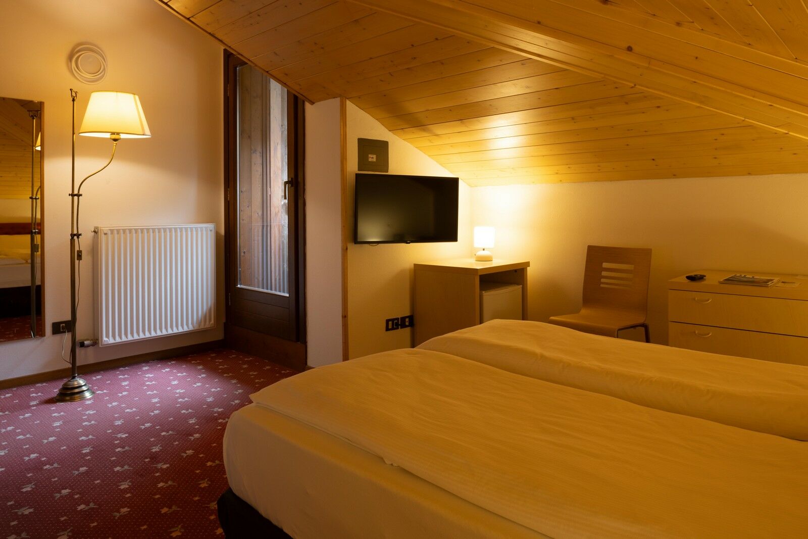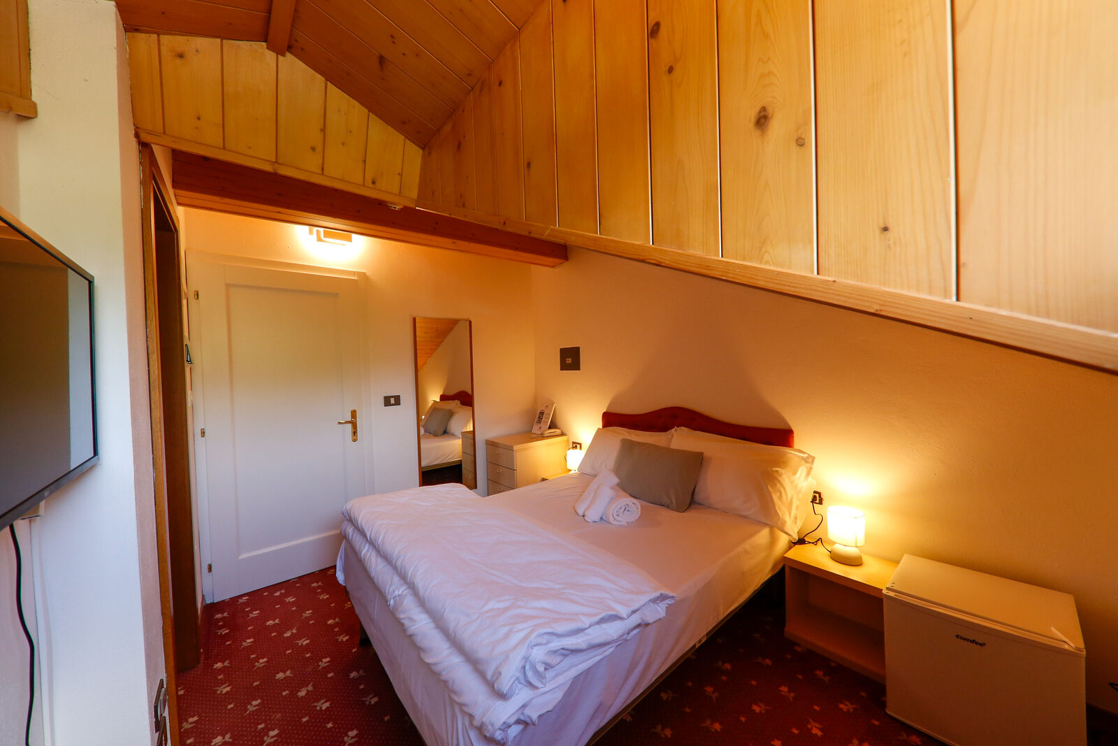 Una camera doppia all’ultimo piano del nostro hotel, con soffitto mansardato e spiovente, una morbida moquette, con vista sulle verdi montagne della Valle di Ledro. Silenziosa e con letto matrimoniale alla francese, è piccola ma accogliente: l’ideale per chi cerca un ottimo rapporto qualità-prezzo.