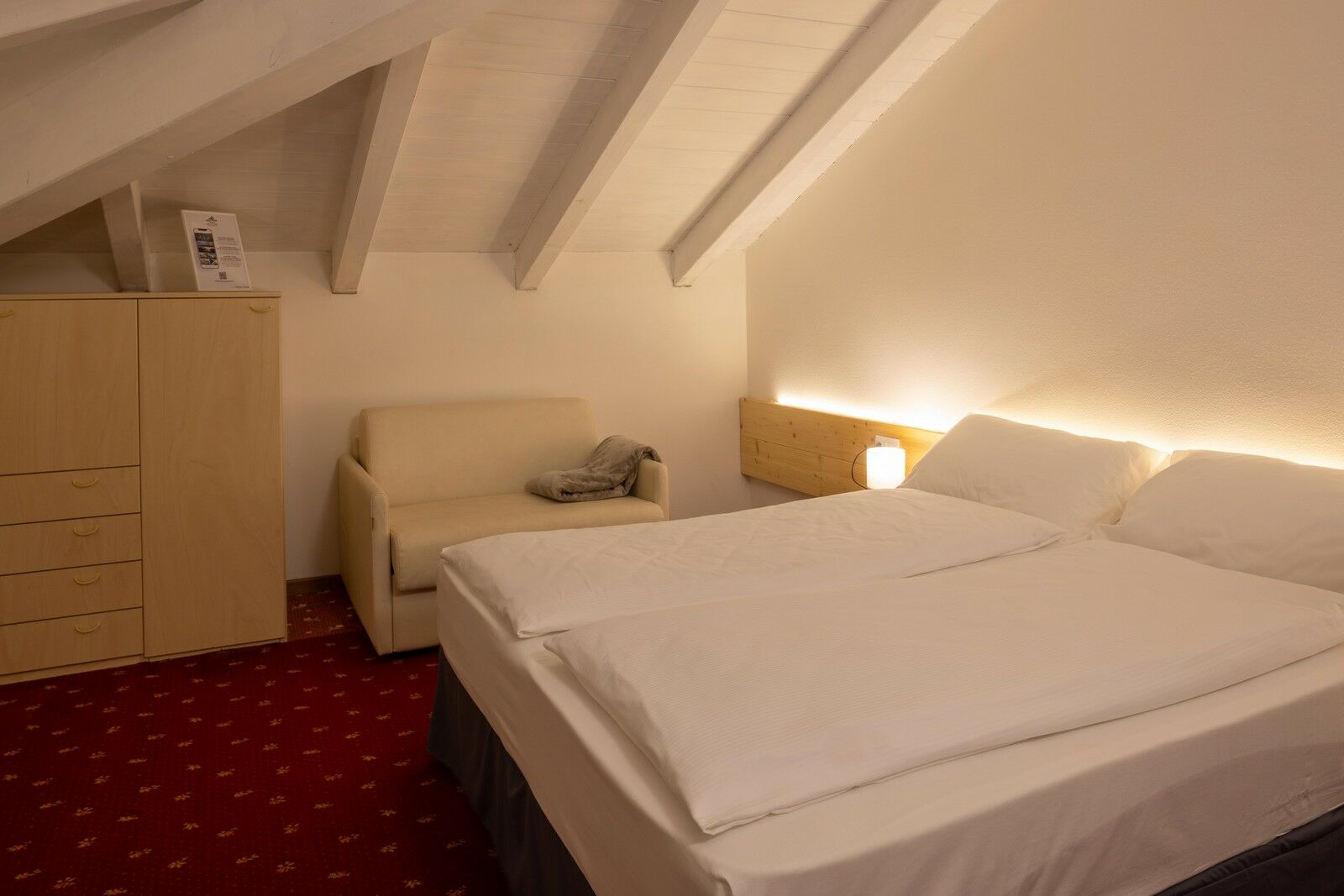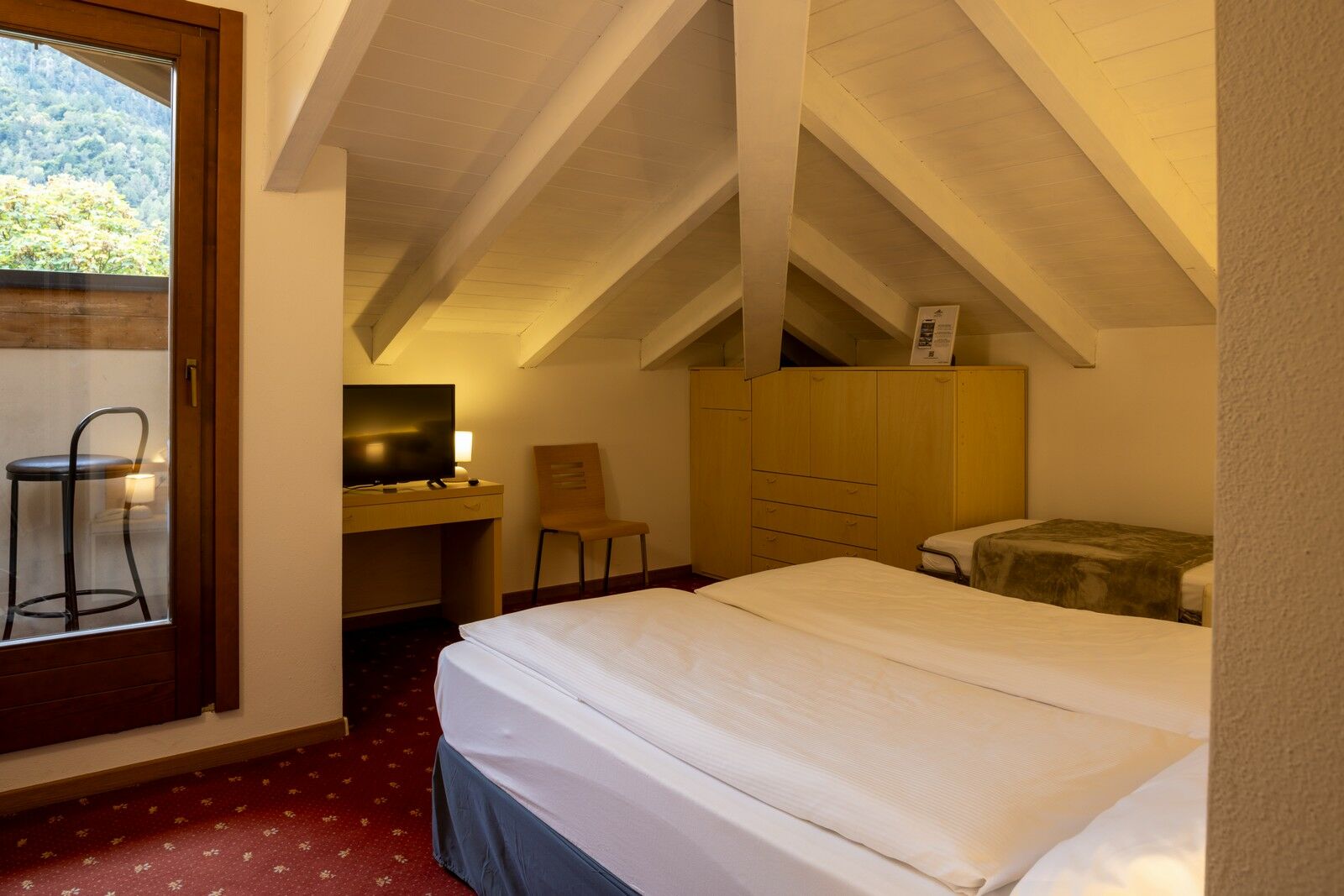Una camera tripla dotata di un letto matrimoniale e di una poltrona che si trasforma in letto singolo per fare spazio a un terzo ospite, il tutto in mansarda, con travi in legno bianco a vista e moquette, con vista sulle montagne circostanti.