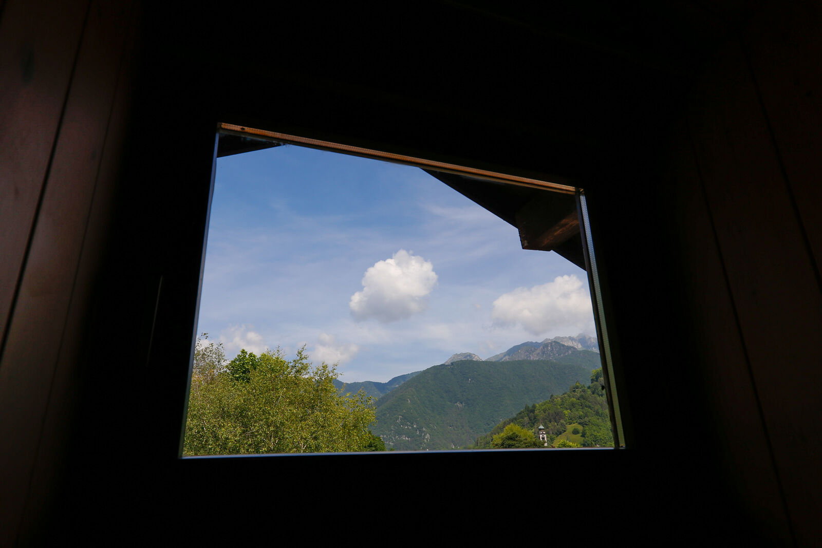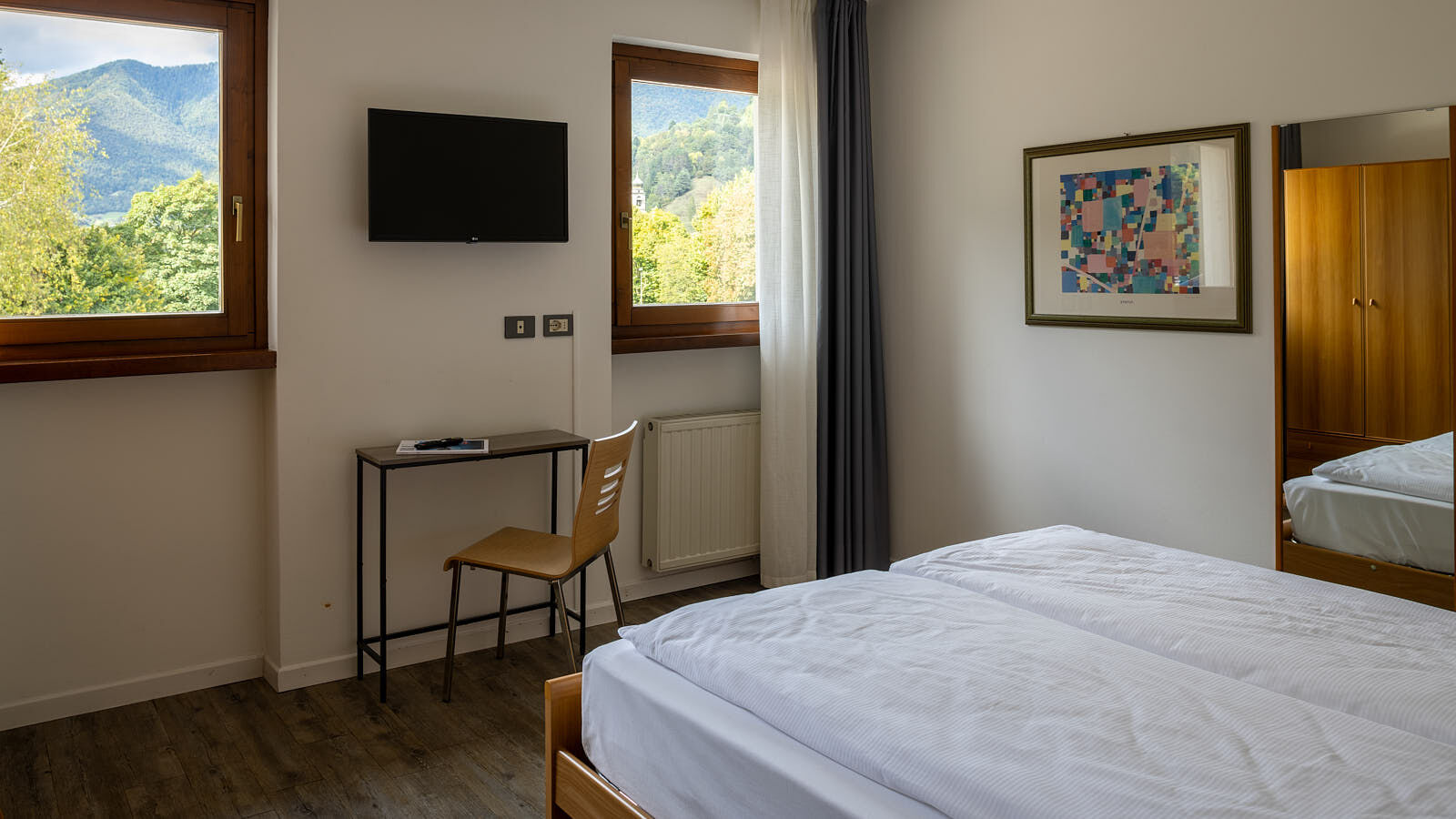 Una camera doppia che dalle finestre offre un panorama sulle montagne della Valle di Ledro: con letto matrimoniale e pouf che si trasforma in letto singolo.